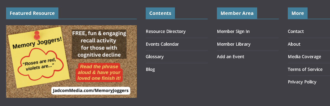 Featured Plan and Pro Plan members enjoy the benefits of increased visibility to Dementia Map© visitors. “Featured Resource” ad blocks appear on the site’s Header, Sidebar, and Footer and appear on every page. They also appear at the end of each lettered section on the Glossary. Your advertisement will be displayed along with other Featured and Pro Plan members. Your selected plan will determine placement.