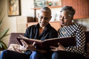 Now, grab the photo album on the coffee table. The supportive conversation should focus on reminiscing. Reminiscing fosters meaningful interactions and encourages automatic communication, allowing Grandpa to share joyful memories and create a deeper connection with you. When the book opens, highlight the photos featuring Grandpa, his siblings, and his parents. Remind him of happy vacations at the lake. As you turn the pages to his wedding day and honeymoon on Route 66, smile at the story of meeting Grandma at that fraternity party. When more pages turn, take this opportunity to read stories from a Family History Book. Be sure to describe the people in the photographs, emphasizing their direct relationship to Grandpa. (“That’s you, your brother Dave, and your dad at the baseball game. Here’s one of you and me on a cruise to the Bahamas.”) Keep questions simple, offer choices, and ask yes/no questions to make the exchange easier as communication abilities change.