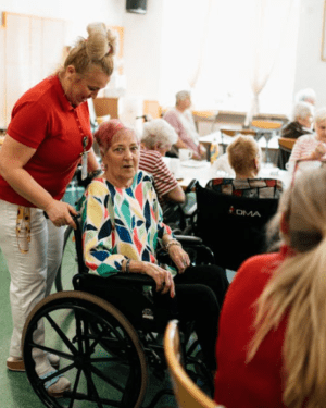 The caregiver is making contact and holding the resident’s hand.  The power of touch is truly amazing.  And, having a family member there to rely on in case of confusion, but having her step back to allow her loved one to communicate with her caregiver speaks volumes on the trust and support of where her loved one lives.