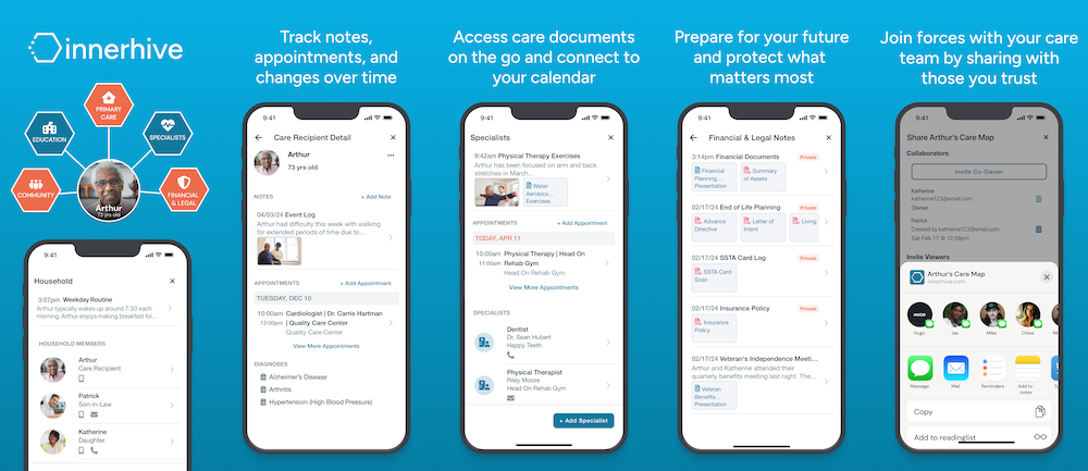 From daily care routines, to advance care planning, Innerhive makes it easy to organize all aspects of care, while saving valuable time and energy. Keep track of key contact info, store critical care documents and notes, manage appointment calendars, find the resources you need, connect with others, be a part of a bigger care community, and share with those you trust to lighten the caregiving load. With everything in one place, and access to an ever-growing resource center, Innerhive helps you focus on what matters most; wellness.