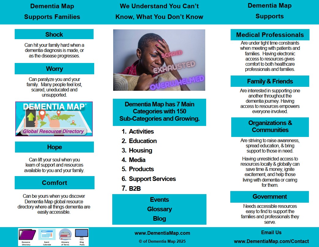 This trifold is a great way to share Dementia Map with your family, friends, support groups, professionals in the care industry, as well as your medical team. Simply save it, forward it via email, or print on 2 sides for a simple flyer.