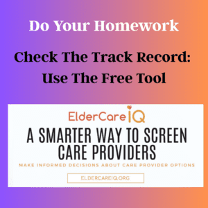 • Check the track record: Use the free tool, Elder Care IQ www.ElderCareIQ.org to view Department of Health inspection reports, violations, and documented cases of abuse or neglect.